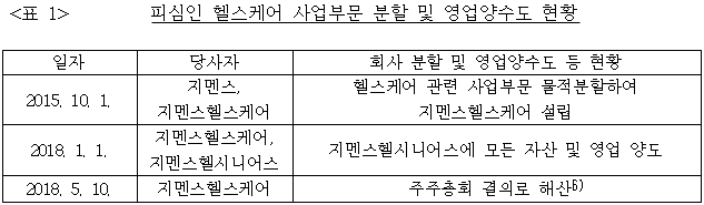 4 한편, 피심인의 헬스케어 관련 사업부분은 이 사건 행위 기간(2010. 10. 1. ~ 2020. 7. 31.) 동안 분할 및 영업양수도 등의 사정이 있었다. 그 현황은 구체적으로 아래 <표 1> 기재와 같다.
