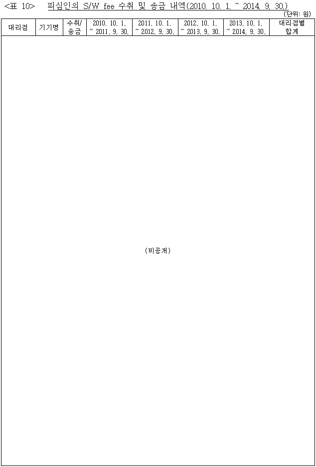 26 피심인이 위와 같은 방법으로 2010. 10. 1.부터 2014. 9. 30.까지 대리점들로부터 수취한 S/W fee 명목의 금액은 총 ●●●●●원이다.