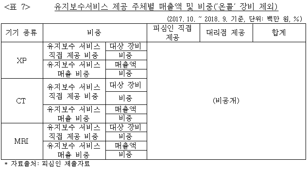 16 피심인의 XP, CT, MRI에 대한 유지보수서비스 제공주체별 매출액 및 비중은 아래 <표 7> 기재와 같다.