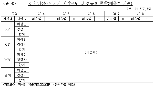 10 피심인은 XP, CT, MRI 등 각종 영상진단기기와 관련하여 다수의 모델을 보유한 유력사업자로서 2014년부터 2018년까지 기간동안 ○○% ~ ○○%의 시장점유율을 차지하였다. 국내 영상진단기기 시장점유율의 구체적 현황은 아래 <표 4> 기재와 같다.