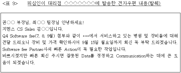 - 실제로 대리점들은 자신들에게 청구된 S/W fee 명목의 금액에 피심인에게 귀속되는 마진이 존재한다는 사실도 알지 못했으며, 피심인의 마진은 독일 지멘스에 전달할 S/W fee 금액의 50% 수준에 이르는 등 상당했다. [본문으로]