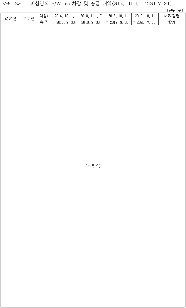 - 피심인이 정한 S/W fee 명목의 기준금액은 이 사건 전기(2010. 10. 1. ~ 2014. 9. 30.)와 후기(2014. 10. 1. ~ 2020. 7. 31.) 모두 동일하게 유지되었다. [본문으로]