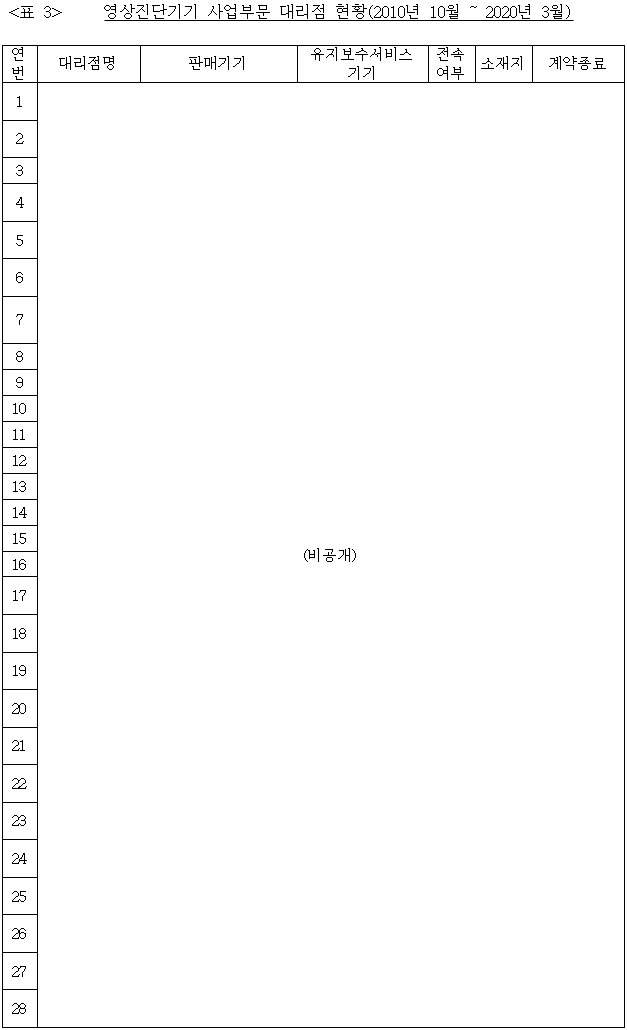 7 피심인은 2010년 10월부터 2020년 3월까지 기간 동안 영상진단기기9를 취급하는 총 28개 사업자와 대리점계약을 체결하여 거래했다. 이 중 현재까지 피심인(지멘스헬시니어스)10과 대리점 계약을 유지하고 있는 사업자는 총 ○○개이다. 구체적인 대리점 현황은 아래 <표 3> 기재와 같다.