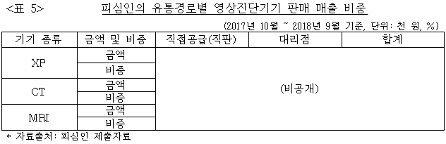 11 피심인은 대형병원과 같이 규모가 큰 수요자의 경우 직접, 그 외 규모가 작은 병원 등에게는 대리점의 재판매 방식을 통해 영상진단기기 제품을 공급하고 있다. 2017년 10월부터 2018년 9월까지 피심인의 XP, CT, MRI의 판매방식별 매출 비중은 아래 <표 5> 기재와 같다.