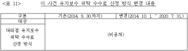 28 피심인27은 2014. 10. 1.부터 2020. 7. 31.까지 이 사건 대리점들을 대상으로 하도급 요율 **% 적용 유지보수 건의 위탁 수수료 산정 방식을 아래 <표 11> 기재와 같이 변경하였다.